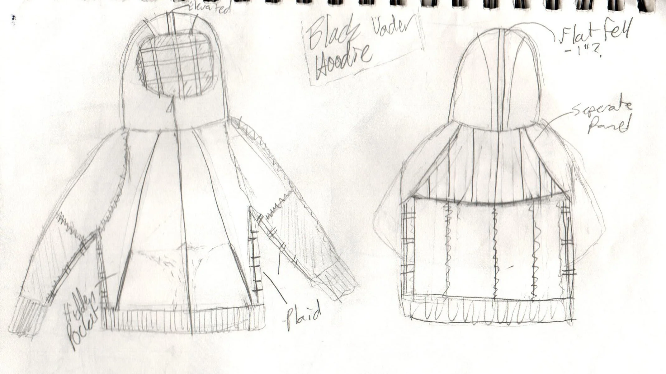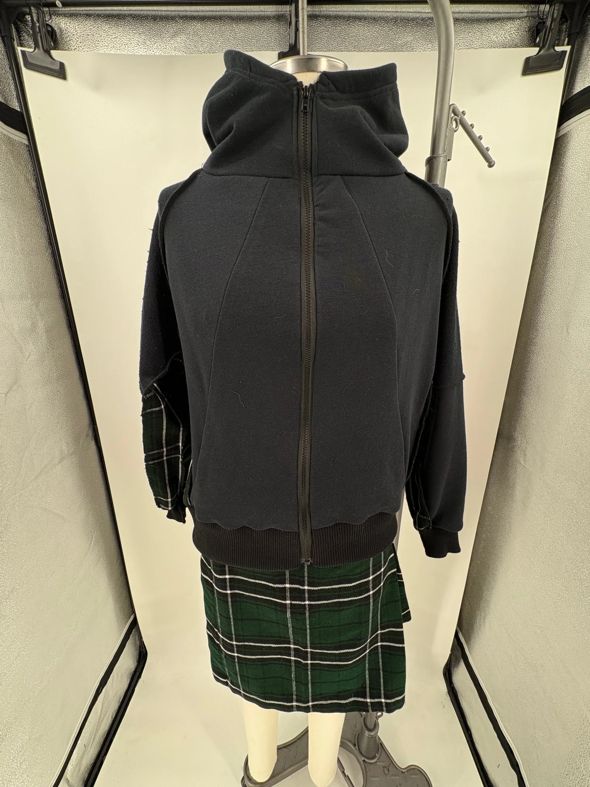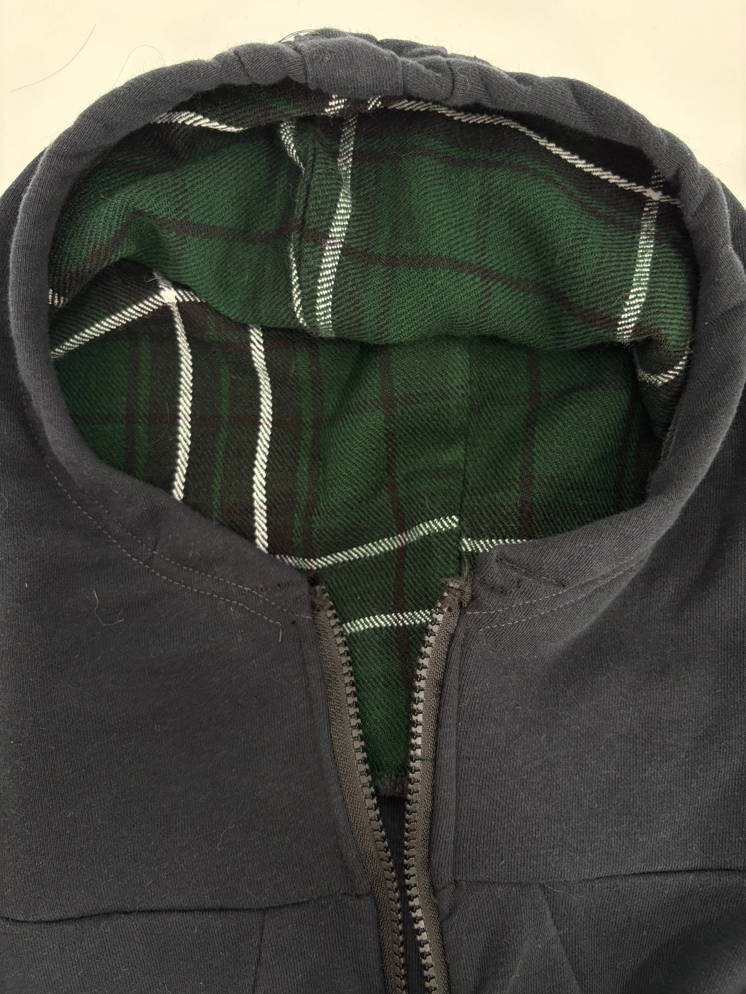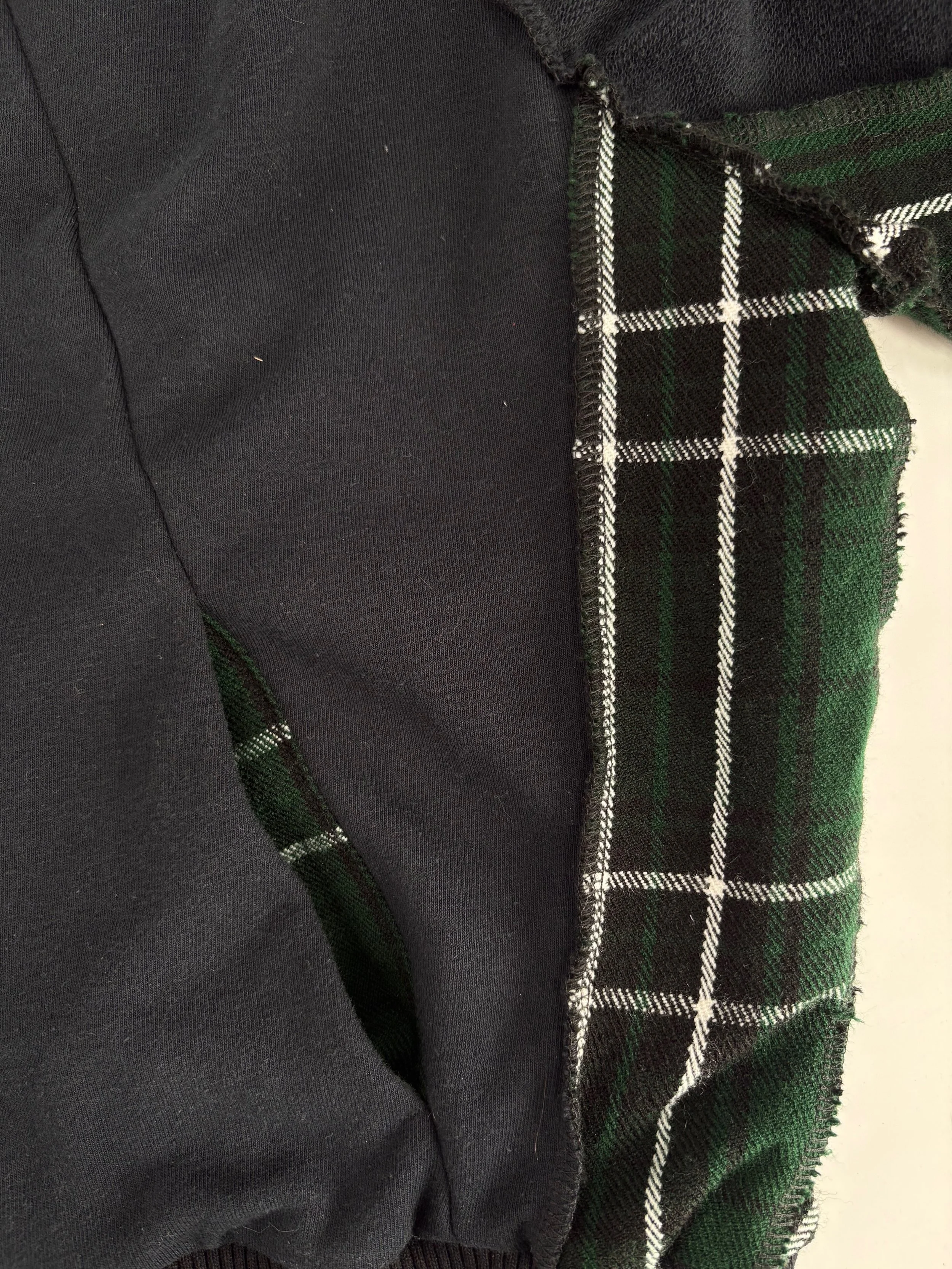 This look originally came from the idea to create myself a kilt in my Mclean family clan colors, and to replicate one of my favorite hoodies. the hoodie’s detailing used the same tartan with a black rib knit as the primary fabric, utilizing exposed serge -stitch edges.